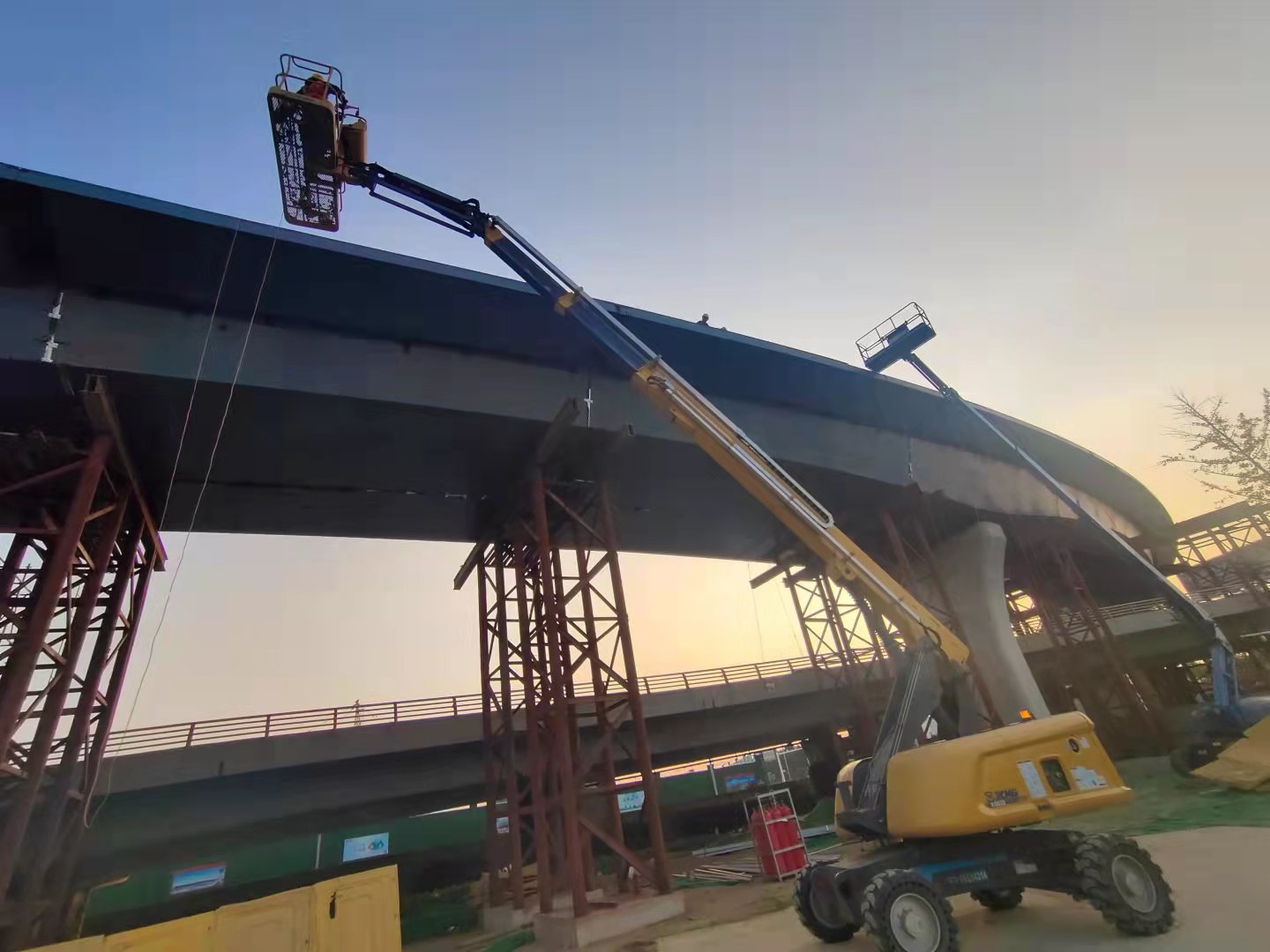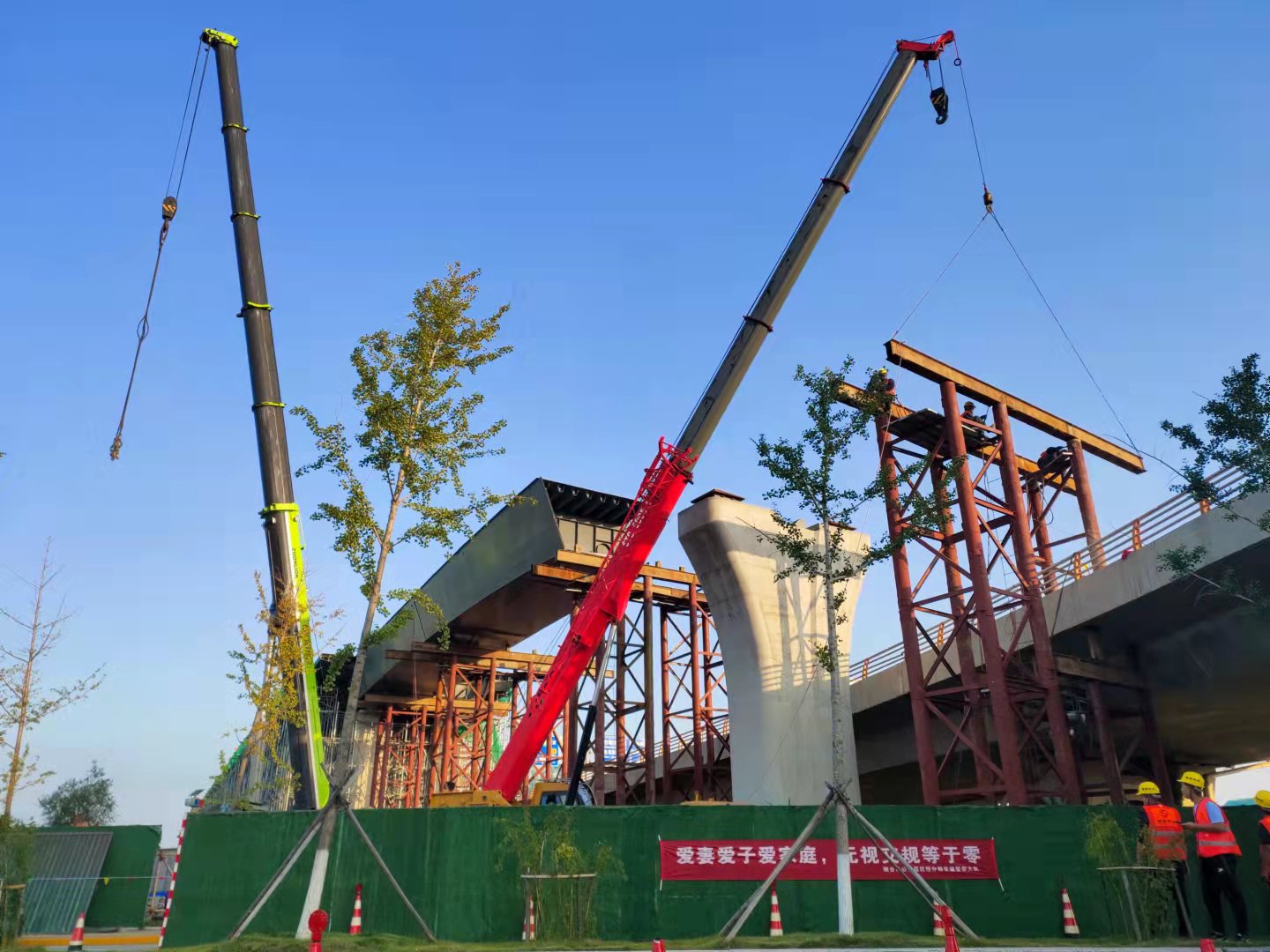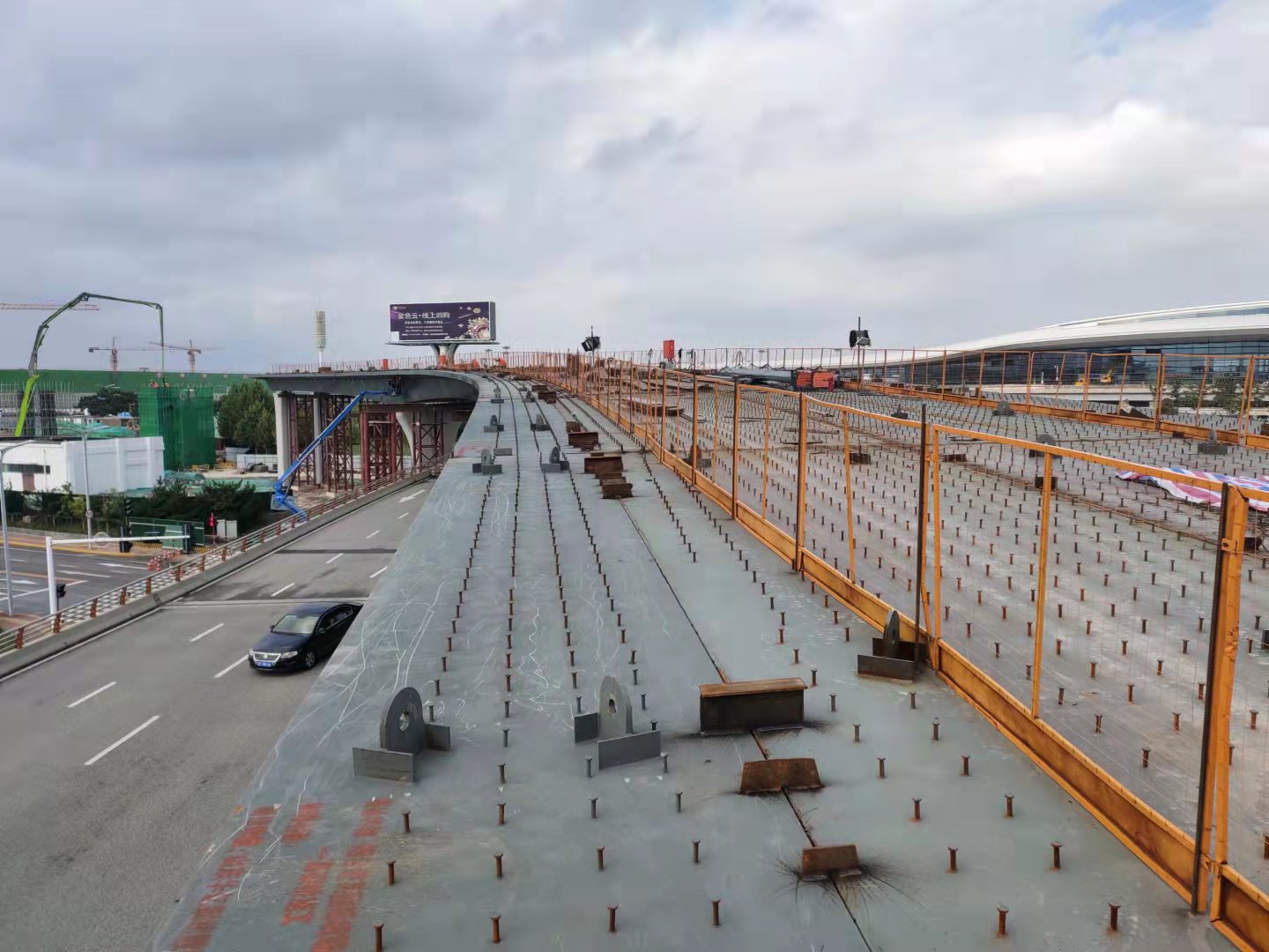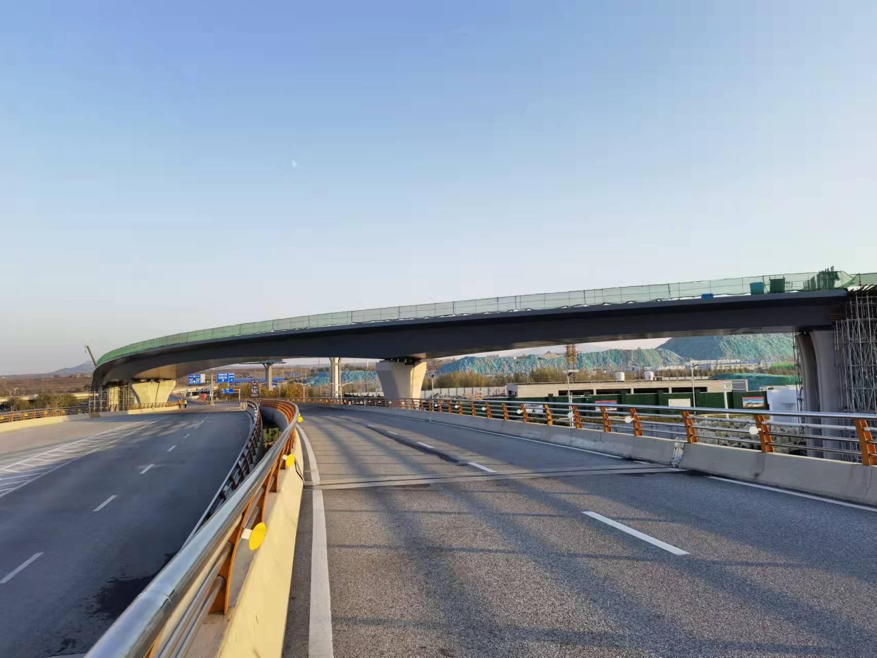 橋梁工程是煙臺蓬萊機場二期擴建工程的重要組成部分,也是整個項目的重要控制性工程。根據(jù)總體方案高架橋梁(G線)南起現(xiàn)狀T1進場高架處,沿T1高架向北跨過空港二路,與T1連接匝道(A線)合并,向西跨過迎賓九路、迎賓十路后到達T2航站樓,終點在航站樓西側向南轉彎后落地接地面出場道路,高架主線 (G線)總長度1635.104m。跨度為37米+62米+37米=136米,橋梁面積18565平方米,總用鋼量1300噸。