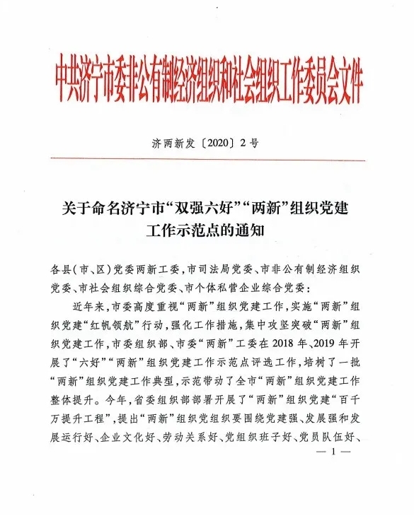 “雙強六好”是在非公有制經濟組織和社會組織范圍中開展的一項評選活動?!半p強六好”即:發(fā)展強、黨建強和生產經營好、企業(yè)文化好、勞動關系好、黨組織班子好、黨員隊伍好、社會評價好。評選旨在培樹先進典型,示范帶動濟寧市“兩新”組織黨建工作整體提升。