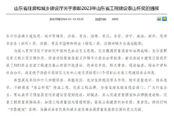 “泰山杯”是我省工程建設(shè)領(lǐng)域最高質(zhì)量獎項,主要突出建筑業(yè)發(fā)展、工程質(zhì)量等10大行業(yè)領(lǐng)域,獲獎工程質(zhì)量代表了山東省工程質(zhì)量的最高水平,此次獲獎是對公司項目建設(shè)工作的充分認(rèn)可。