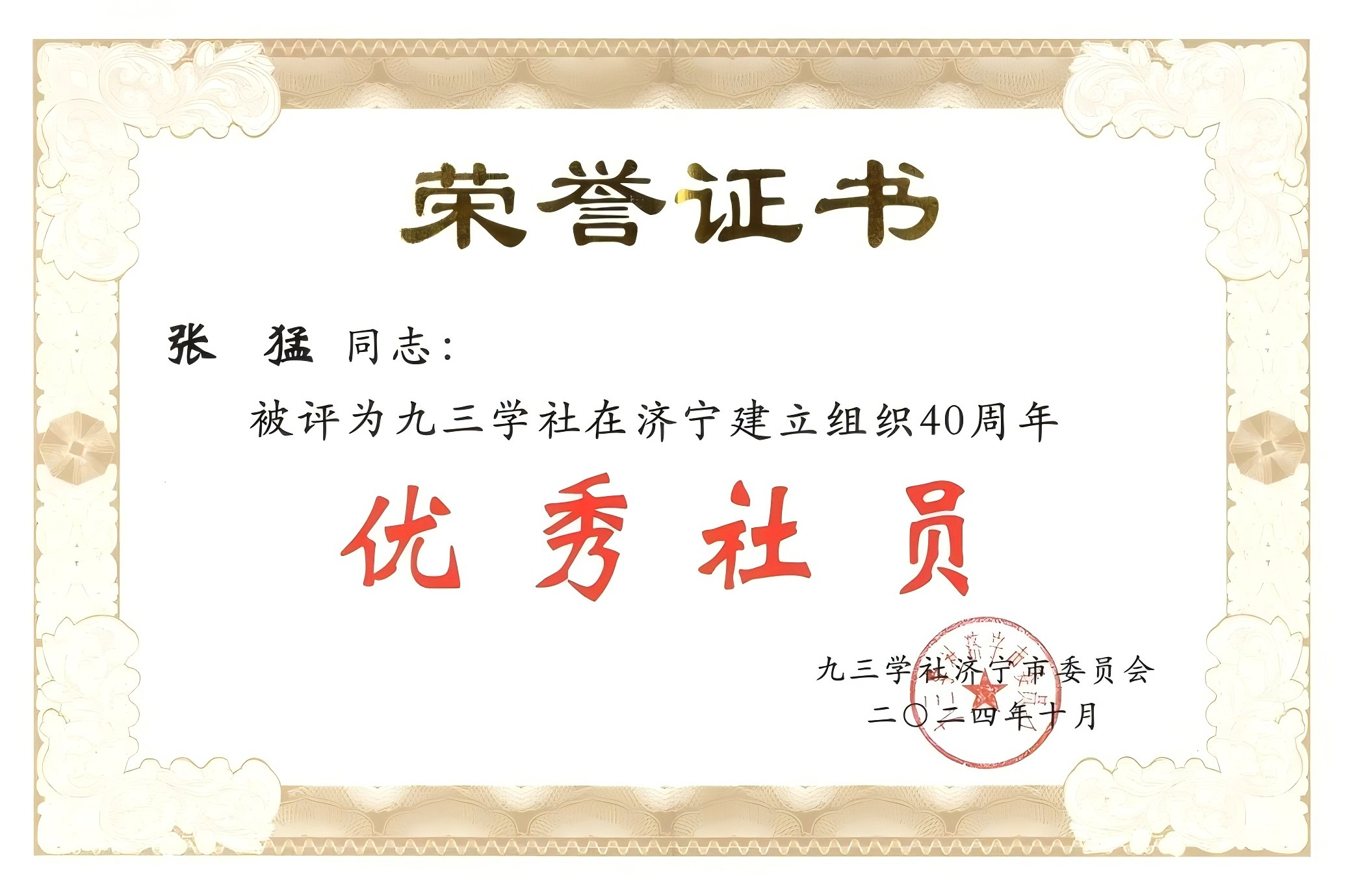 近日,公司董事長張猛被九三學(xué)社濟(jì)寧市委員會(huì)授予“九三學(xué)社在濟(jì)寧建立組織40周年優(yōu)秀社員”榮譽(yù)稱號(hào)。這一殊榮不僅是對(duì)張猛董事長個(gè)人貢獻(xiàn)的認(rèn)可,更是對(duì)他多年來在社會(huì)責(zé)任、企業(yè)發(fā)展和行業(yè)貢獻(xiàn)方面所做出積極努力的高度贊揚(yáng)。