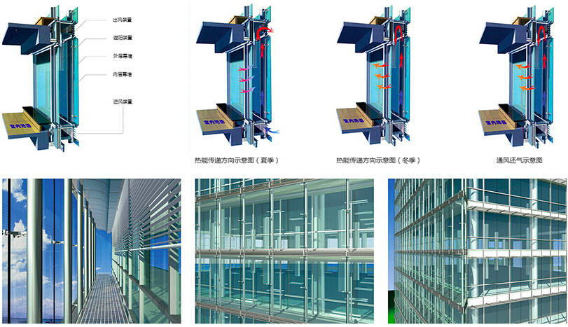雙層幕墻系統(tǒng)是由內(nèi)、外兩層幕墻組成,并在兩層幕墻中間形成一個(gè)換氣通道,通過幕墻通風(fēng)設(shè)備的開關(guān)可使雙層幕墻中間進(jìn)入或逸出空間,開窗后房間可進(jìn)行自然通風(fēng),幕墻中間的遮陽裝置可控制太陽光的輻射熱對室內(nèi)溫度的影響。其設(shè)計(jì)原理是實(shí)現(xiàn)節(jié)能、環(huán)保,使室內(nèi)生活工作環(huán)境與室外自然環(huán)境達(dá)到融合。